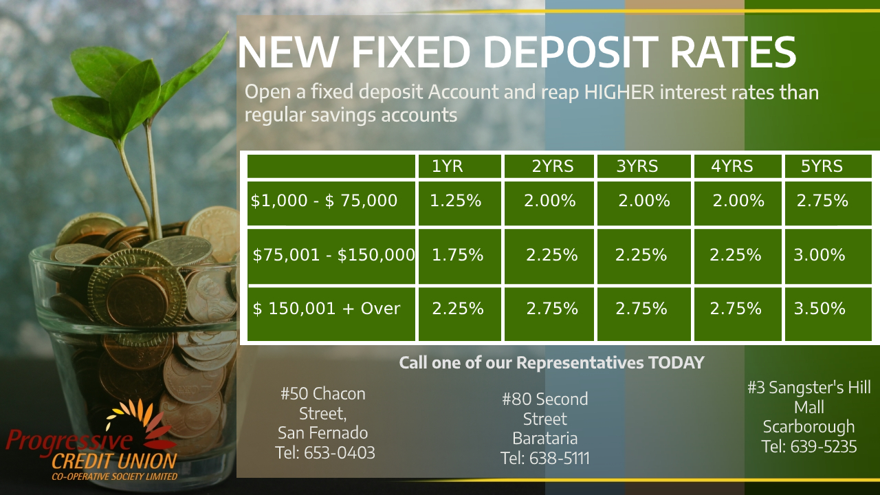 Fixed deposit accounts allow members to invest their funds for longer periods of time at higher rates of interest. The terms range from 1 to 5 years.